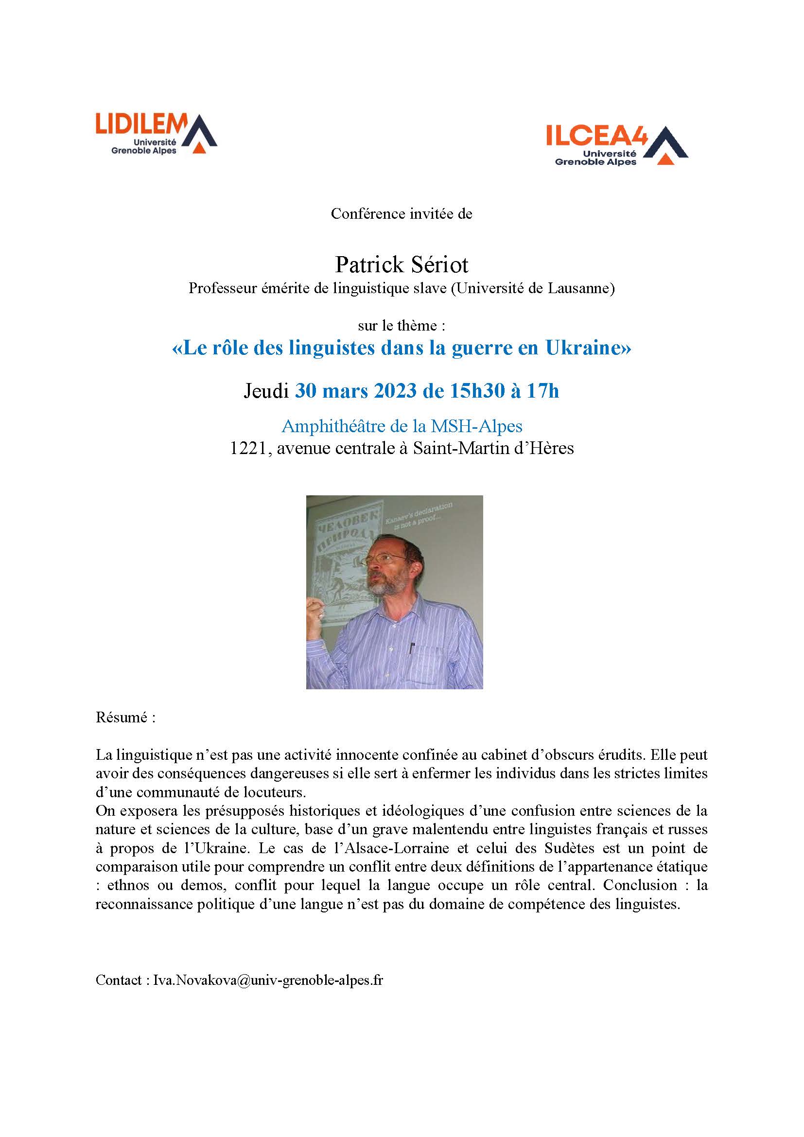 — 30 mars, 15h30 : Patrick Sériot donne une conférence à l'université de Grenoble-III Stendhal: «Le rôle des linguistes dans la guerre en Ukraine»