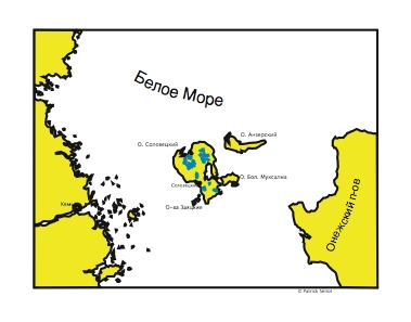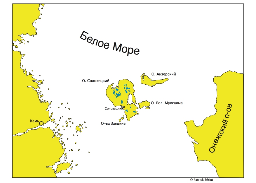 | L'Archipel des Solovki se trouve à 60 km de Kem', en Carélie. La traversée est parfois difficile, à cause du temps très instable. La Mer Blanche est souvent noire. |