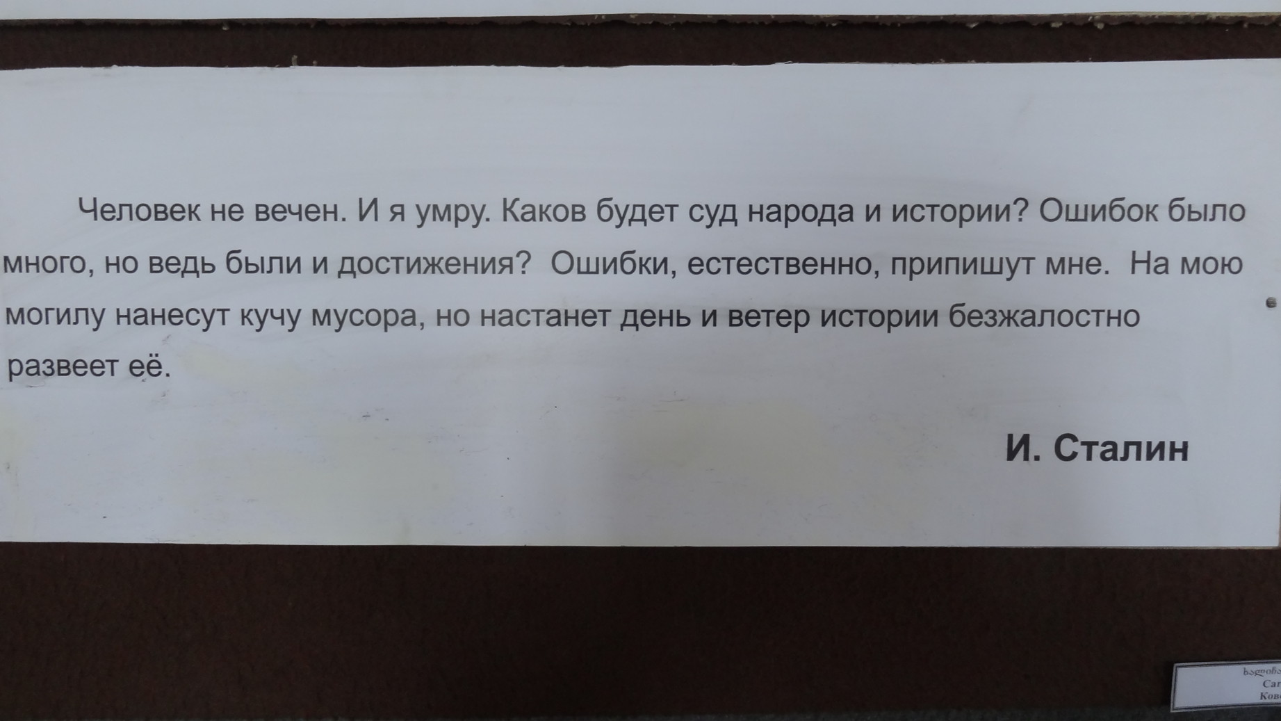 Le musée Staline est une sorte de cathédrale kitch à la gloire de l'enfant du pays. Poète à ses heures, grand chef militaire, homme sage et «personnalité extraordinaire». Pas un mot sur les répressions, la terreur, ou le rapport Khrouchtchev.