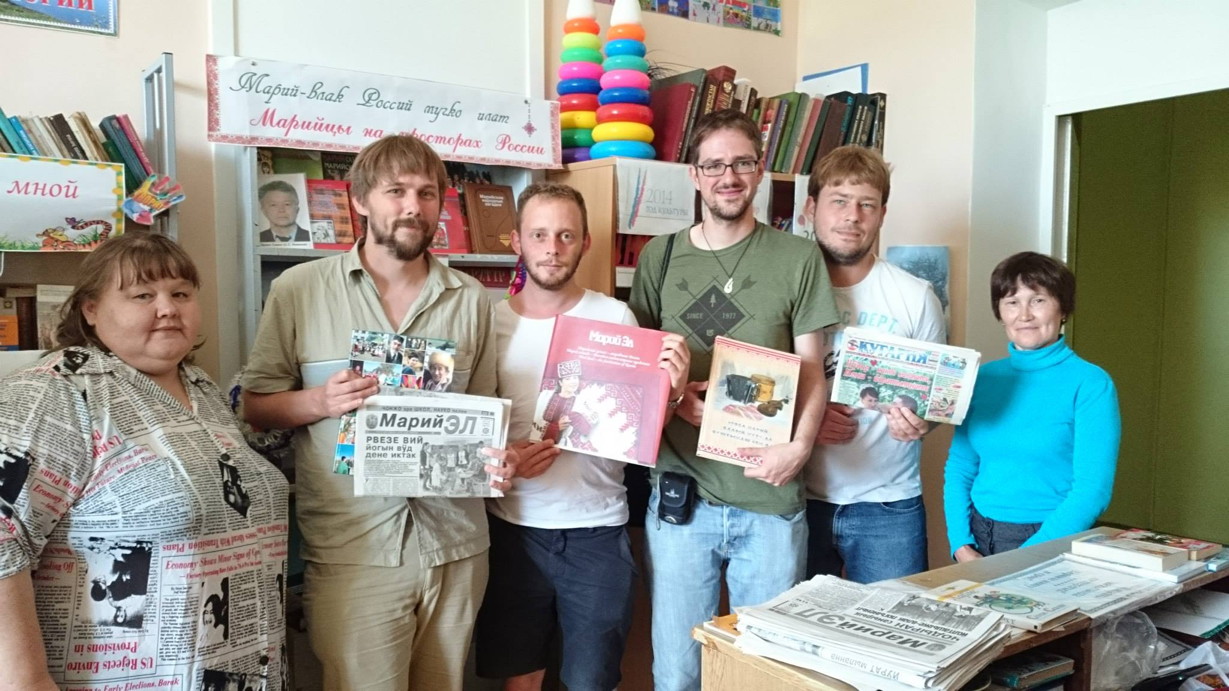 | Quatre participants (au centre) de l'école d'été de mari, avec la bibliothécaire (à gauche) de l'école de Püncherjal/Sosnovka (Bachkortostan) |