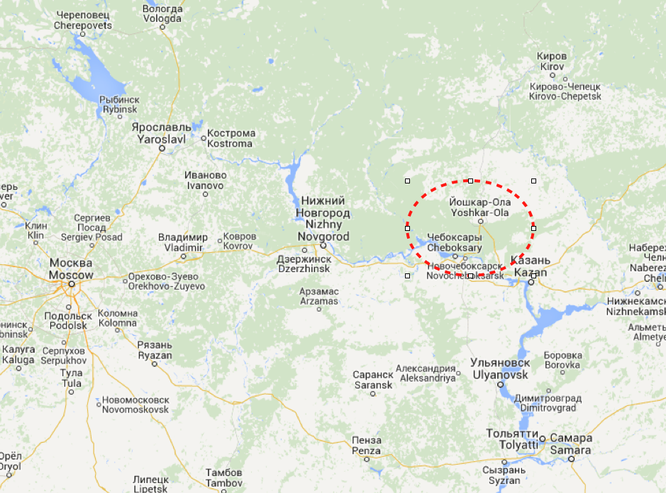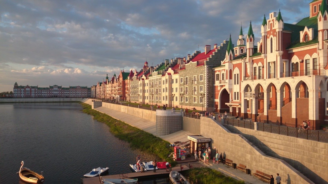 | Rive de la Petite Kokshaga à Yoshkar-Ola, appelée "Bruges" de façon très officielle (http://visitola.ru/). Ce style pseudo-nordique envahit Yoshkar-Ola depuis quelques années. |