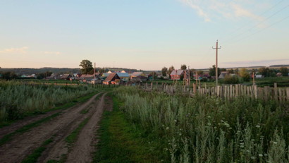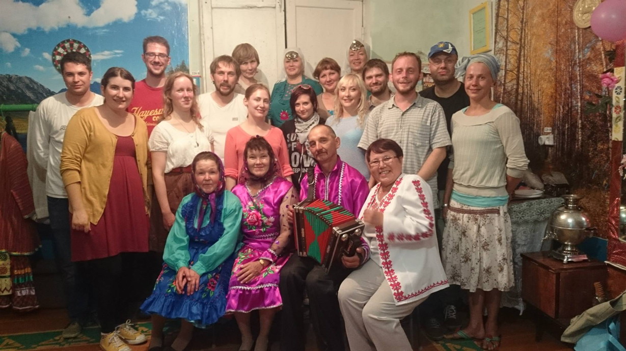 | Avec les participants et enseignants de l'école d'été de mari (debout) et quelques habitants (assis et femmes en costume au fond) du village de Tynbayevo (Bachkortostan). |