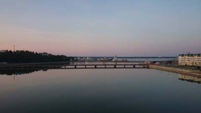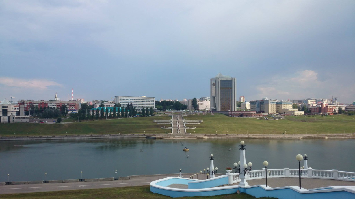 Le "zaliv" de Cheboksary. La tour au centre-droite de la photo est le siège du gouvernement de Tchouvachie. |
