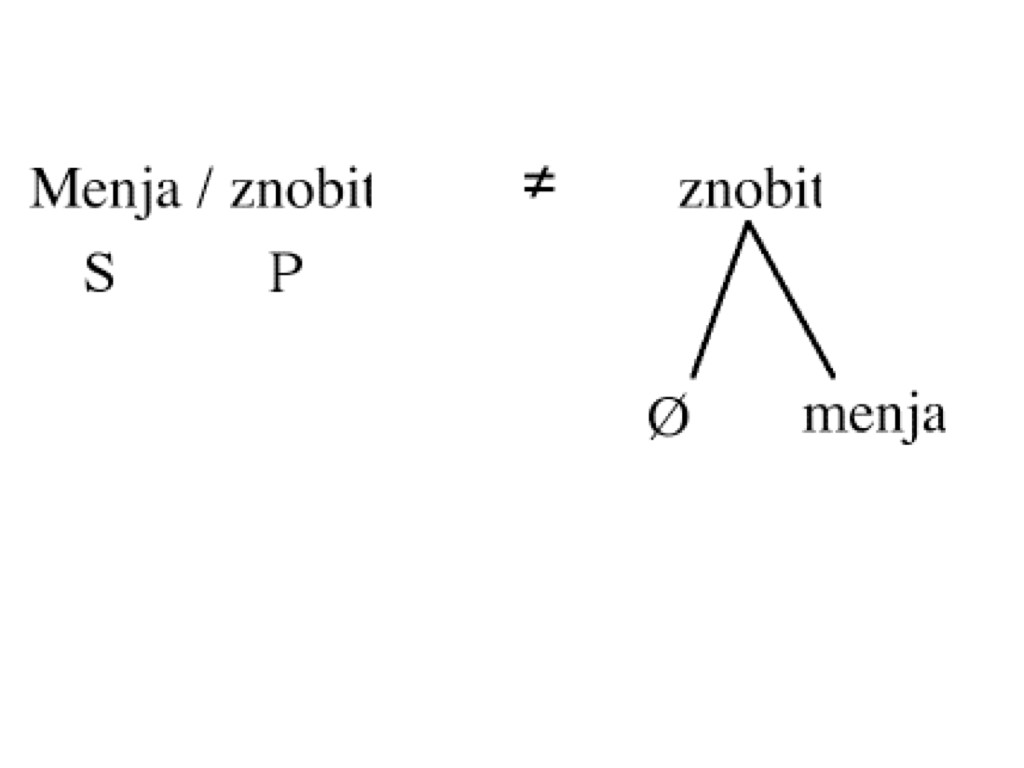 Il est clair que la série de morphèmes š-/ ty- / i- joue ici exactement le même rôle que -o / -i/ -a en italien, à ceci prêt que ces morphèmes sont antéposés et non postposés, et qu’ils dénotent la personne seule et non le temps. Ainsi, je, prononcé soit [š] soit [ž] est un indice de personne, morphème inséparable du radical verbal, et non un pronom : il ne remplace aucun nom. On a donc ici l’explication du fait qu’en français on peut dire Moi, je parle [mwašpaRl], alors qu’en allemand *Ich, ich spreche ou en russe * Ja, ja govorju sont impossibles.