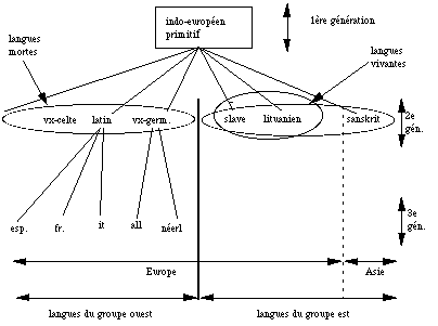 Cette division spatiale est redoublée par une opposition d’ordre historique, ou plutôt généalogique. En effet le latin, le gotique, le grec ancien, le vieux-celte, le thrace (ancêtre de l’albanais pour Hilferding), ainsi que l’avestique (7) représentent un ensemble de langues parentes qui se différencient du sanskrit et entre elles par des divergences phonétiques régulières. Elles ont toutes en commun d’être actuellement des langues mortes, disparues, qui ne subsistent plus que dans «des langues de formation secondaire, altérées par le temps et par des apports extérieurs» (p. 33). Les actuelles langues parlées en Europe (langues romanes, germaniques, celtiques, le néo-grec et l’albanais, auxquelles il faut ajouter le persan, langue d’Asie qui fonctionne comme les langues d’Europe en ce qu’il est issu d’une langue de deuxième génération : l’avestique) appartiennent ainsi à une troisième génération, elles ne sont pas au même niveau que le sanskrit