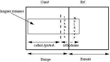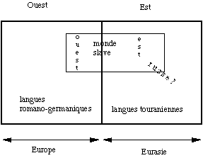 On a bien ici coïncidence des «mondes» et des langues. L'Europe est habitée par des peuples parlant des langues romano-germaniques, le Monde du Milieu par des peuples gréco-slaves.