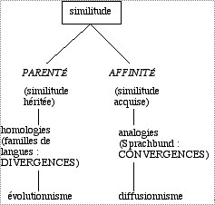 Les linguistes contemporains sont de plus en plus tentés d'admettre qu'il existe un type de parenté linguistique, dit « affinité » (21) , qui unit des langues qui ne remontent pas, en dernière analyse, à un prototype commun. Ce n’est pas une opinion universellement acceptée. Il y a toujours des linguistes qui écarteraient comme fantaisiste toute suggestion de ressemblance structurale entre des langues non apparentées génétiquement ou qui verraient dans ces ressemblances le fait du hasard, l'effet d'un substrat psycho-biologique commun à tous les hommes, en un mot, un cas de ce que Hugo Schuchardt a appelé Elementarverwandschaft. (Martinet, 1959 [1975 : 25])
