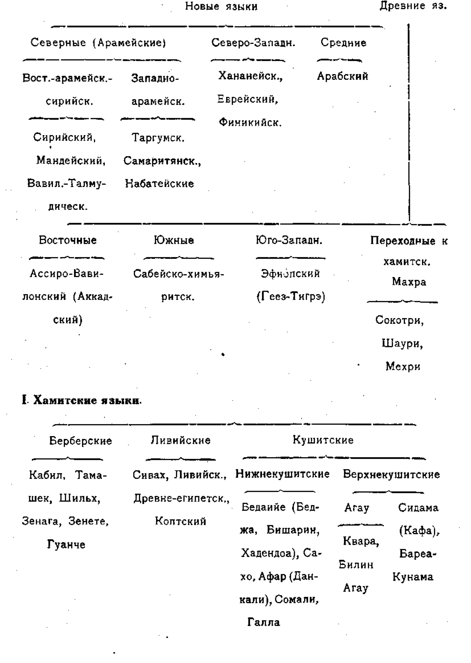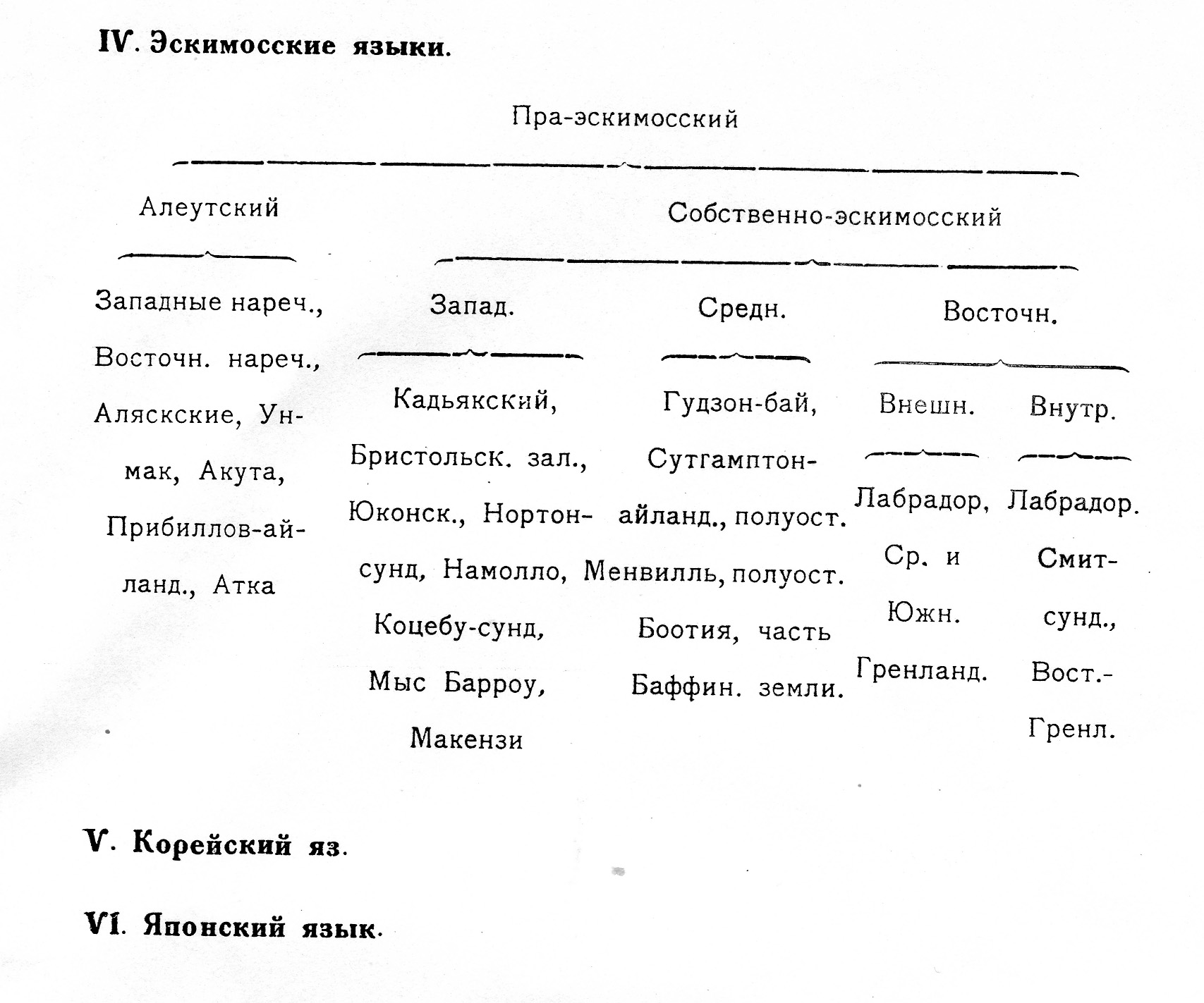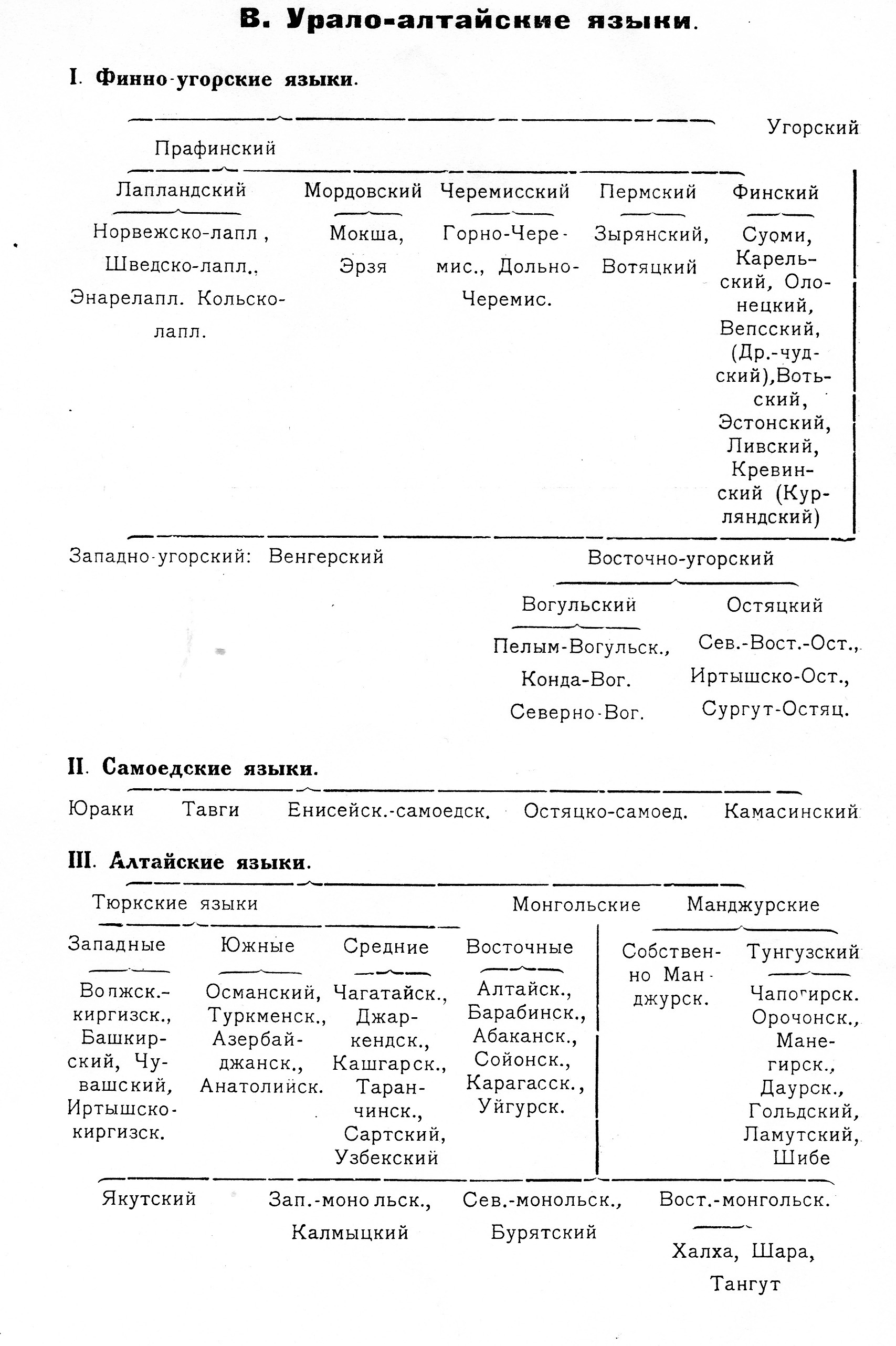 урало-алтайских (финно-угорских, тюрко-татарских, монгольских, тунгузских), индоевропейских, в средней области — языков хамито-семитических, тибето-китайских, на юге — языков банту, дравидских, полинезийских, языков ароваков и карибов. Эти языковые семейства создались на почве предшествовавшего языкового развития, в результате соединения и смешения разных языков и их элементов, соответственно тому, как из соединения и смешения создалась и культура и этнический состав их племен и народов. В системах этих языков встречаются все особенности предшествующих стадий и форм языкового развития, в разных степенях и пропорциях, соответственно характеру преобладающего смешения, т. е. тому, произошло оно в кругу северных племен отцовского права, как в языках тюрко-татарских (отсутствие родов имен), или в среднем кругу, как в языках семитических (более устойчивая категория рода), или в южном кругу, как в языках дравидских. Позднейшие переселения при этом изменили первоначальное географическое положение и отношение языков, что также необходимо принять во внимание при их изучении.