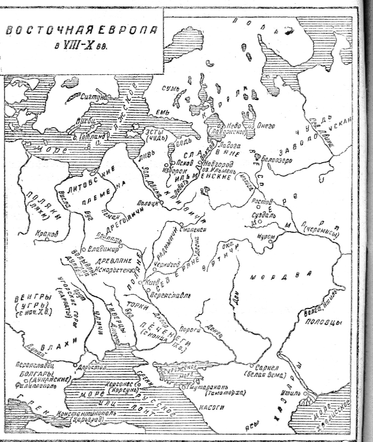 3. В VIII-IХ вв. среди приднепровских славян появляются полчища скандинавов; они садятся в укреплённых местах и начинают покорять себе славянские племена; их называют русью... Занявши южные области, русь недружелюбно встречает новых, последующих выходцев из Скандинавии... Колонизационная волна вынуждена поэтому оседать в местностях, более близких к Скандинавии и менее привлекательных по природным свойствам. Так скандинавы занимают озерную область