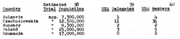 Although no state within the Soviet Union is even listed as having any delegates to the Universala Esperanto-Asocio in the Jarlibro for 1954 (figures are given with a closing date of December 31, 1953),[37] statistics on delegates and members or the UEA in Communist-dominated areas„ are as follows:[38]