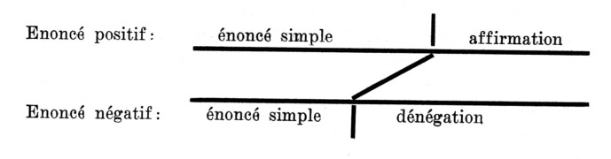 Dire «non» n'est pas le simple pendant de dire «oui». Un énoncé positif est normalement la constatation de ce qui est; il se présente d'ordinaire comme une notation directe, comme la réaction du sujet parlant à la perception du réel : « II fait jour. Tout le monde est parti. » Un énoncé négatif apparaît en quelque manière comme une notation du second degré, qui suppose comme intermédiaire un énoncé positif non exprimé : « II ne pleut pas » est la constatation faite par quelqu'un qui s'est d'abord imaginé qu'il devait pleuvoir. Dans une certaine mesure, l'énoncé positif est plus immédiat, plus automatique; l'énoncé négatif est une sorte d'interprétation; il représente, comme dit M. Ch. Bally (Linguistique générale et linguistique française, p. 196) «un refus d'assertion».