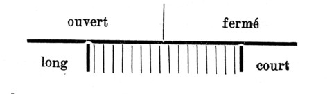 Le mécanisme de la litote diffère suivant la nature de l'élément qui est à la base de l'énoncé. Si nous prenons le cas élémentaire de l'adjectif, il faudra distinguer entre les adjectifs qui expriment une caractérisation absolue non susceptible de nuances ou de degrés (une quantité est ou n'est pas égale à une autre; un objet est ou n'est pas noir; «il faut qu'une porte soit ouverte ou fermée»...), et les adjectifs qui expriment une caractérisation relative, comportant le plus ou le moins (une maison est plus ou moins haute, le temps est plus ou moins beau, etc...). Dans le premier cas on passe immédiatement de l'affirmation à la négation: dès qu'une porte cesse d'être ouverte, elle est fermée; dans le second cas il y a une zone d'interprétation: entre une canne qu'on dit longue et une canne qu'on dit courte, il y a place pour les cas où la longueur de la canne est telle qu'on n'éprouve pas le besoin de la caractériser; en d'autres termes, long signifie notablement long, et court signifie notablement court. De ouvert à fermé le passage se fait sans transition; entre long et court il y a une sorte de zone d'indifférence; il y a un degré zéro. C'est ce qu'on peut figurer grossièrement par le schéma suivant:
