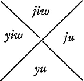 examine à une date donnée tous les parlers d'une région où a dû être parlée à une date antérieure une même langue et où, dans la mesure du possible, chaque localité a eu un développement linguistique autonome (notion toute relative, bien entendu), on observe qu'à une forme de la première époque répondent des formes diverses suivant les localités, et que chacune des particularités divergentes a son extension propre. Soit par exemple la région du département français des Landes étudiée par M. Millardet, dans son Petit atlas linguistique des Landes ; soit le mot latin vulgaire yugu « joug » ; la région étudiée se divise en quatre parties, disposées de la manière suivante (réduite à un pur schéma), en tenant compte des formes prises par le mot :