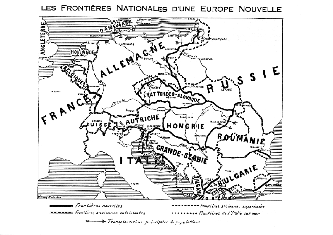 Ces frontières hypothétiques représentent le minimum de ce que les Alliés pleinement victorieux exigeraient. Mais ce minimum représente à son tour une notable diminution de la puissance austro-allemande et comme il correspondrait avec l'équité «nationale», il est à présumer qu'il serait de bonne politique prévoyante de s'en tenir à lui, quitte à exiger d'autres compensations ou garanties (indemnités de guerre écrasantes, occupation temporaire et purement militaire de certaines provinces allemandes, etc.)