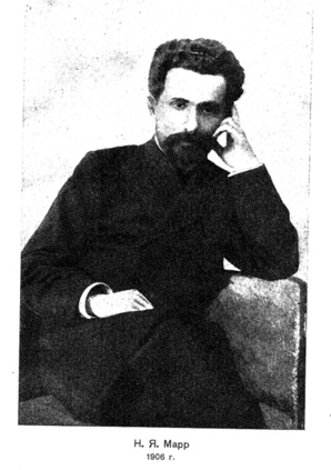 Вопросы увязки языка с историей общественных форм, с историей материальной культуры занимают в этот период первое место в работах Н. Я., окончательно сокрушающего учение индоевропеистов. Яфетическая теория стала на путь марксистской методологии; язык получает определение как надстройка, обусловленная в конечном счете социально-экономическим состоянием общества. Вначале как будто неожиданно для себя встречаясь в отдельных выводах с марксизмом-ленинизмом, с углублением палеонтологии речи и уделением особого внимания вопросам происхождения речи и мышления и их взаимоотношений, Н. Я. все увереннее и тверже конкретизирует на языковом материале основные положения марксизма-ленинизма.