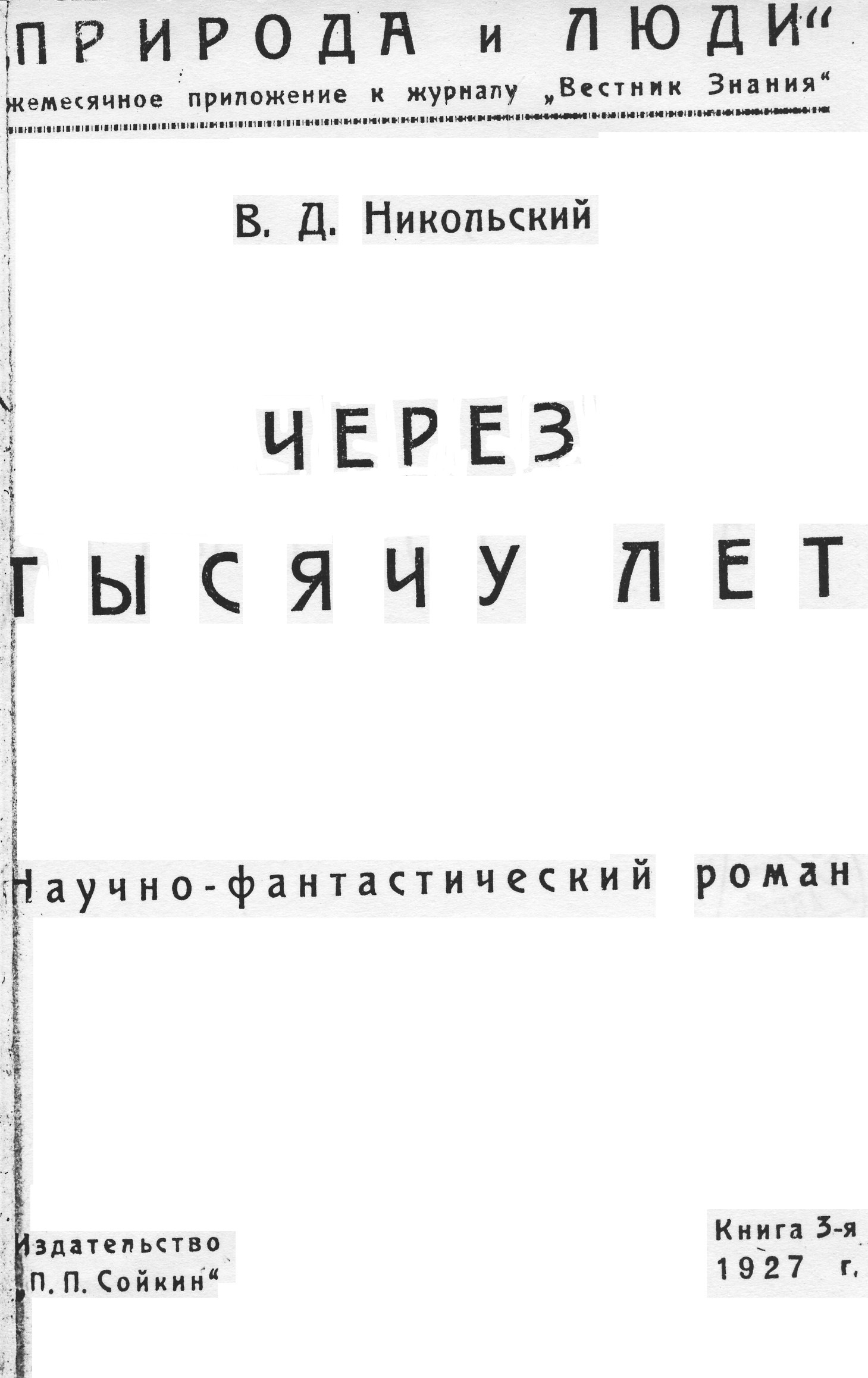Автор этих очерков, объединенных под общим заглавием: «Через тысячу лет», далек от мысли дать здесь всеобъемлющую картину будущего строя. Он хочет лишь, придав этим очеркам беллетристическую форму, поделиться с читателем некоторыми своими техническими мечтами о жизни наших далеких потомков, — мечтами, которые могут служить для многих единственной яркой путеводной звездой в сумерках нашего настоящего...