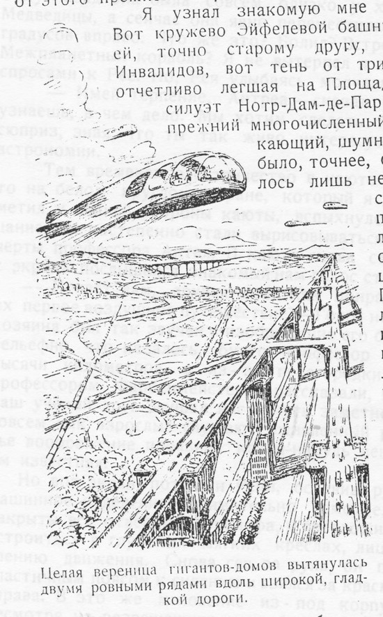 Я узнал знакомую мне излучину Сены… Вот кружево Эйфелевой башни — я обрадовался ей, точно старому другу, вот купол дома Инвалидов, вот тень от триумфальной арки, отчетливо легшая на Площадь Согласия, вот силуэт Нотр-Дам-де-Пари… Но где же прежний многочисленный, кипящий, сверкающий, шумный Париж? Его не было, точнее, от него сохранилось лишь несколько десятков старых строений, памятники прошлого, воспоминания о давно отзвучавшей эпохе. Старый Париж утонул в зеленых зарослях исчез, раскинувшись лугами исполинских аркад, терявшихся в сизой дымке далекого горизонта. Целая вереница гигантов-домов вытянулась двумя ровными рядами вдоль широкой, гладкой дороги.