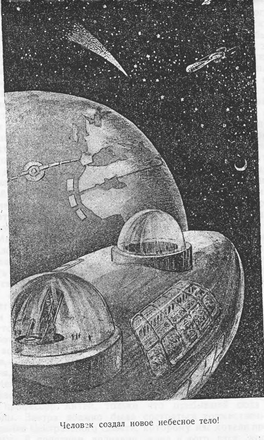 — Да, мы можем гордиться этим сооружением, — продолжал Рени. — Удачное его завершение стоило тоже немалых жертв человечеству. Смелая идея создания новой луны, где могла бы быть устроена идеальная астрономическая обсерватория вне всякого влияния атмосферы, — была брошена еще несколько столетий тому назад, — впрочем нет, еще раньше мысль о ней, конечно в наивной и незаконченной форме, встречается в одном научно-фантастическом романе первой четверти XX века, я забыл, к сожалению, имя автора этой забавной книги, которую теперь нельзя читать без улыбки… Но к реальному воплощению этой смелой идеи человечество могло приступить лишь около ста лет тому назад, когда усовершенствовались способы междупланетного сообщения. Внутри этой планеты находятся жилые помещения, сады, площадки для игр, оранжереи, лаборатории, все нужные аппараты, моторы, а также богатые запасы воздуха, провианта и энергона — особого вещества, дающего двигательную силу нашим воздушным кораблям и машинам. Вещество это служит источником тепла и света для Урании, сообщая при помощи реактивных приборов всему ее телу различные необходимые положения в пространстве. Сама Урания прочно связана силой тяготения с землей и навеки, пока сама не разрушится, останется ее сателлитом. Особенно трудна была доставка сюда гигантского зеркального объектива диаметром в 150 метров. Чудом точной механики были также приборы, посредством которых можно удерживать в пространстве оптическую ось телескопа — сам объектив неподвижен, все же необходимые повороты автоматически достигаются вращением самого тела новой плане-