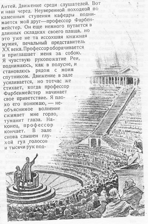 Антей. Движение среди слушателей. Вот и наш черед. Неуверенной походкой по каменным ступеням кафедры поднимается мой друг — профессор Фарбенмейстер. Он еще немного путается в длинных складках своего плаща, но это уже не та иссохшая книжная мумия, печальный представитель XX века. Профессор оборачивается и приглашает меня за собою. Я чувствую рукопожатие Реи, поднимаюсь, как в полусне, и становлюсь рядом с моим спутником. Движение в зале усиливается, но тотчас же стихает, когда профессор Фарбенмейстер начинает свое приветствие. Я плохо его понимаю — необъяснимое волнение сжимает мне горло, туманит глаза. Наконец, профессор кончает. В зале снова слышен глухой гул голосов и тысячи рук под-
