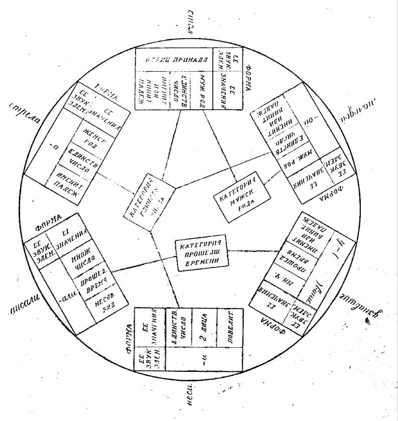 В целях более наглядного усвоения процесса образования формальных категорий я предлагаю просмотреть помещаемую здесь (стр. 111) схему, для верного понимания которой, однако, еще нужно иметь в виду следующие примечания: 1) схеме придана форма круга не с какой-либо специальной целью, а лишь для удобства расположения слов и образуемых категорий, 2) выбор и количество расположенных по окружности слов носят произвольный характер, 3) формы анализируемых слов не исчерпаны, так как это не требуется существом дела, 4) количество образуемых категорий также могло бы быть во много раз увеличено (можно было, например, показать еще категории именительного падежа, множественного числа и т. д.).