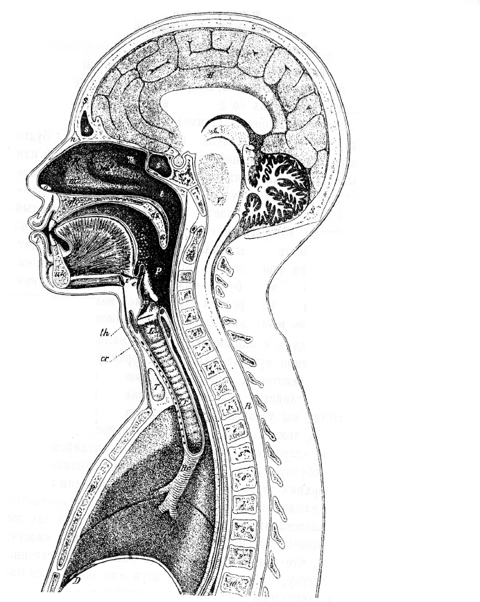 Под органами речи обычно понимают легкие, бронхи, дыхательное горло, гортань, полость носа, полость рта, ограничиваемую с разных сторон небом (передним твердым и задним мягким, заканчивающимся заостренным и очень подвижным «язычком»), альвеолами, зубами, губами, нижней челюстью и языком. Благодаря крайней подвижности последнего полость рта постоянно меняет свою форму, образуя всякий раз иной резонатор для выдыхаемой голосовой струи, т.-е. придавая ей другой характер.