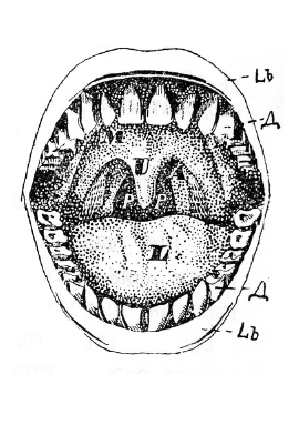 Рис. 2. Полость рта со стороны губ. L — язык РР— зев; М — мягкое небо; U — язычок; Lb— губы; ДД — зубы (переднее твердое небо скрыто верхними зубами.