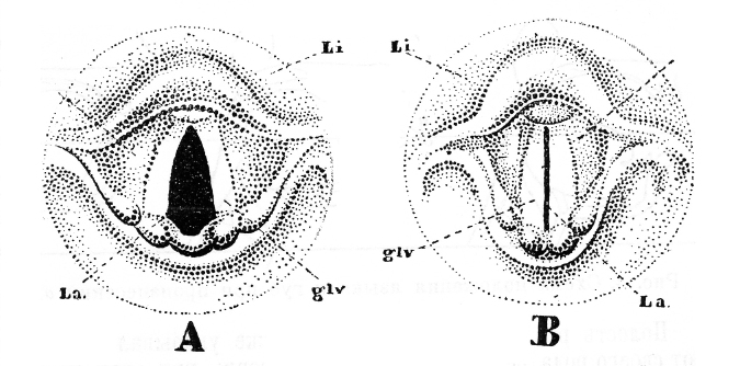Рис. 3. Голосовые связки. А — вид гортани сверху при покойном дыхании с помощью гортанного зеркала; В — вид гортани при голосе; glv— голосовые связки; La — гортань; Li — язык.