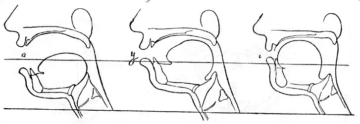 Рис. 4. Схема положения языка и губ при произнесении а, у, и.
