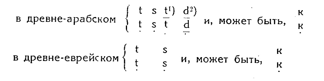 [25] Этой паре согласных в более позднюю эпоху соответствует пара z-ẓ, так как уже в раннем средневековьи ṭ > ẓ Ср. Brockelmann — Grundriss d. vergl. gramm d. semitischen Sprachen. В. 1. S. 129.