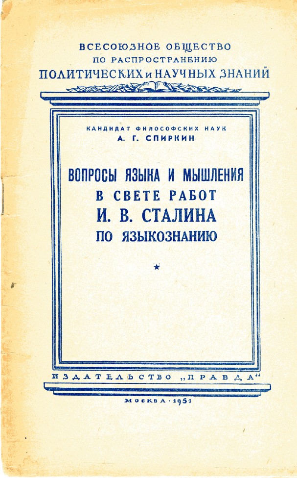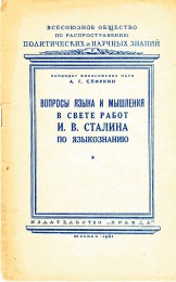 Гениальное сталинское произведение «Марксизм и вопросы языкознания» представляет собой величайший вклад в науку о языке и в марксистско-ленинскую философию. Глубоко и всесторонне вскрыв природу языка как общественного явления, как средства общения, обмена мыслями и взаимного понимания людей в обществе, И. В. Сталин показал, что язык может выполнять свою основную общественную функцию потому, что он непосредственно связан с мышлением, что он регистрирует и закрепляет результаты работы мышления.