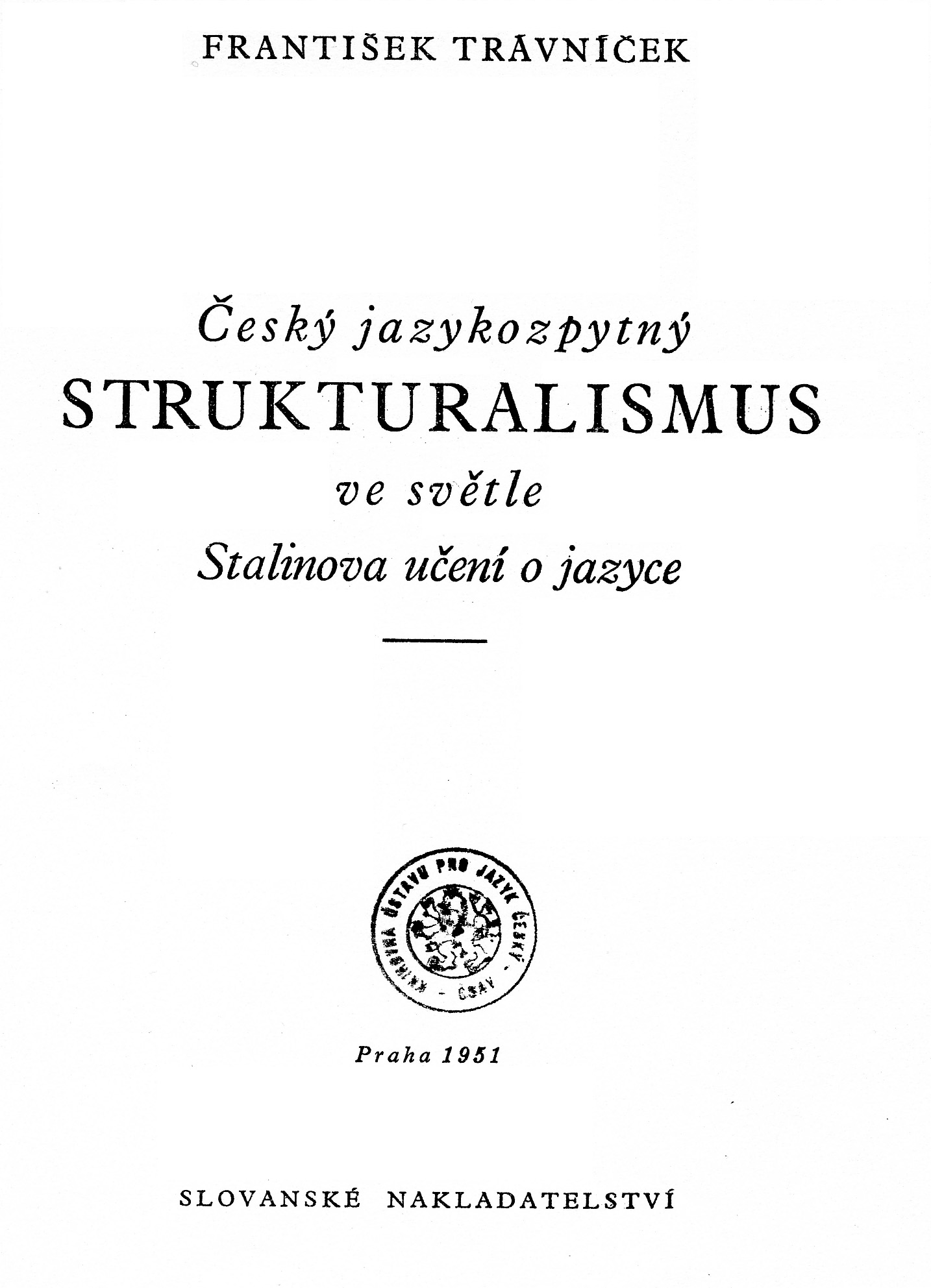 -- František TRÁVNÍČEK : Český jazykozpytný strukturalismus ve světle stalinova učení o jazyce, Praha : Slovanské nakladatelství, 1951